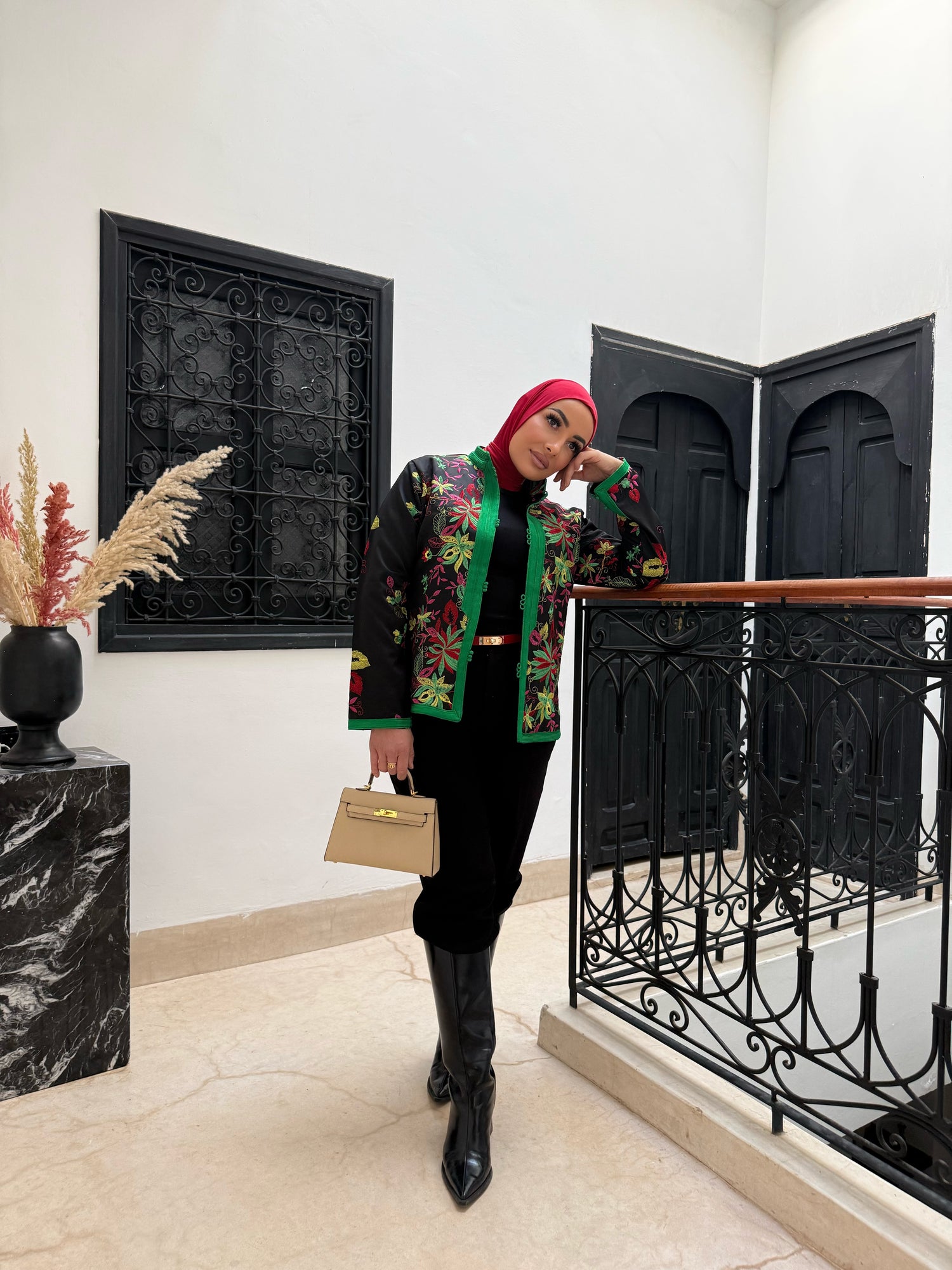 Cette veste noir profond est sublimée par des broderies florales multicolores réalisées avec une finesse exceptionnelle.