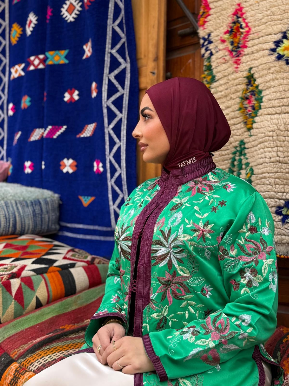 Le vert, symbole de renouveau et d’ancrage, s’illumine au contact des fleurs brodées, créant un contraste riche et raffiné.