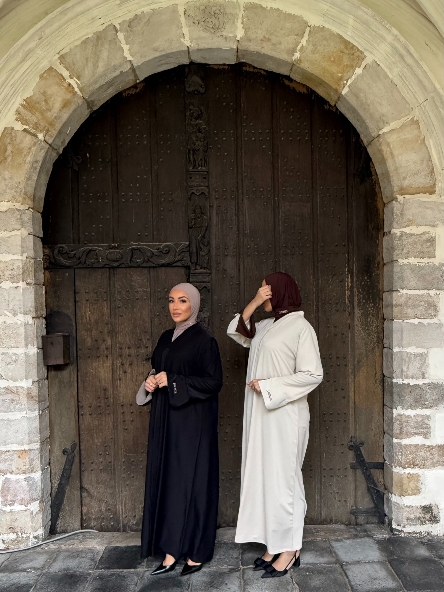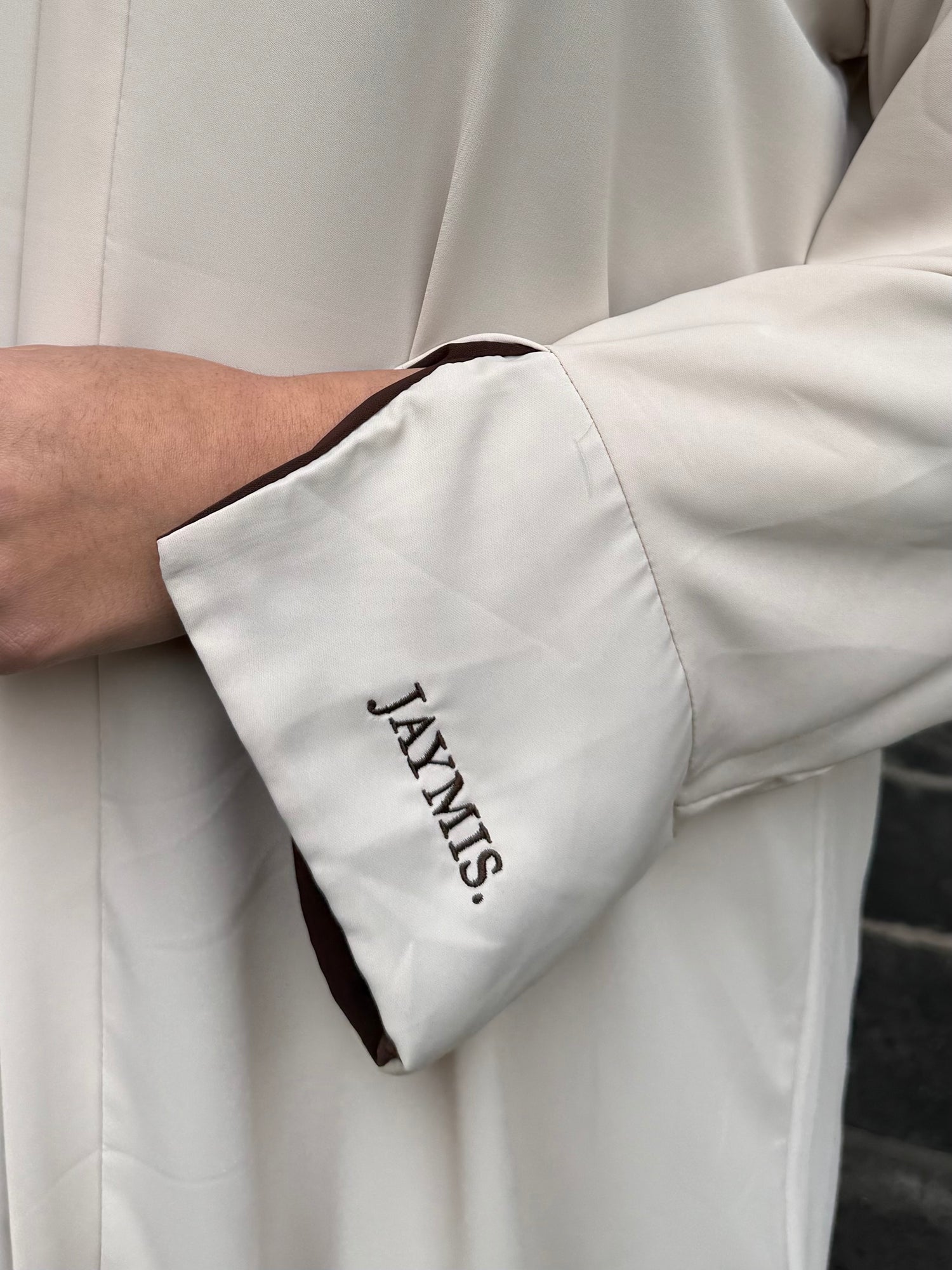 L’abaya SABLE incarne la douceur du beige sublimée par une broderie marron signature JAYMIS. délicatement apposée sur la manche.